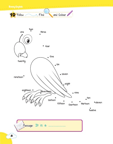 Bonny Eng ish 10 Follow , Find and Colour two one three four five twenty six seven nineteen eight eighteen seventeen nine ten sixteen fifteen thirteen eleven fourteen twelve Mess Message: It is a .......................... Mess age: age: 8
