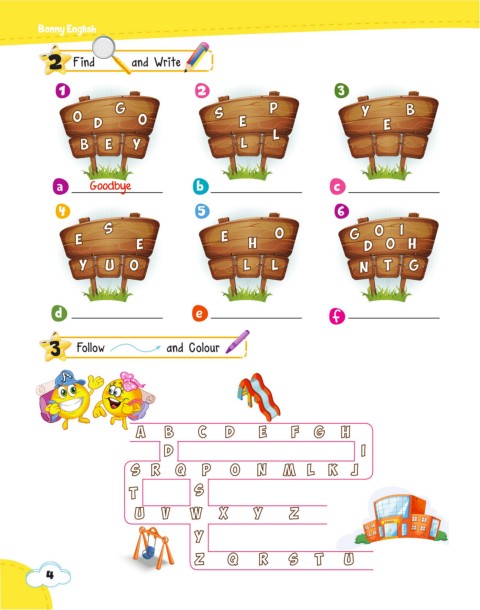 Bonny Eng ish 2 Find and Write 1 2 3 G p Y B o o S D e e l b e y l a Goodbye b c 4 5 6 S o o i e e e h g d o h y u o l l n t G d e f 3 Follow and Colour A B C D E F G h D i s r q p o n m l k j t s u v w x y z y z q r s t u 4
